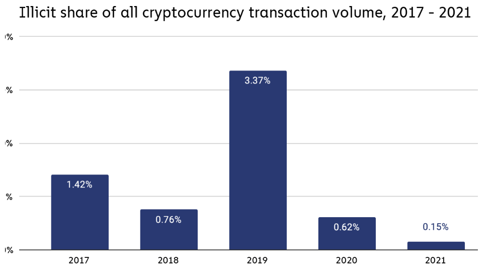 Les activitĂ©s criminelles sur les cryptomonnaies augmentent car celles-ci ont connu une Ă©volution importante ces derniĂšres annĂ©es. Pour autant la proportion dâactivitĂ©s criminelles est passĂ©e de 3,37% en 2019 Ă 0,15% en 2021.